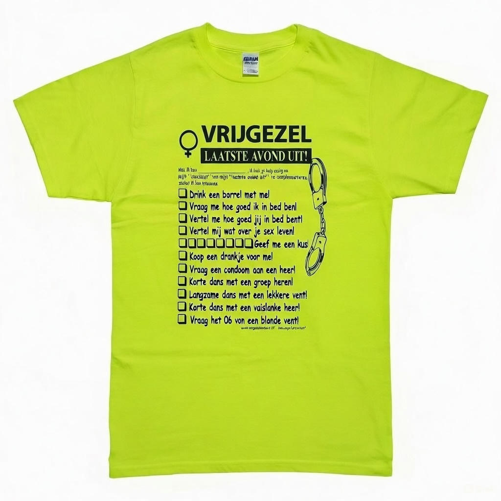 Met dit shirt geef je de vrijgezel gelijk leuke opdrachten die hij/zij kan afvinken, onmisbaar bij een vrijgezellenfeest.